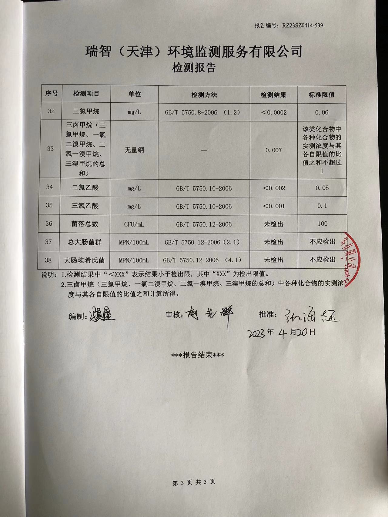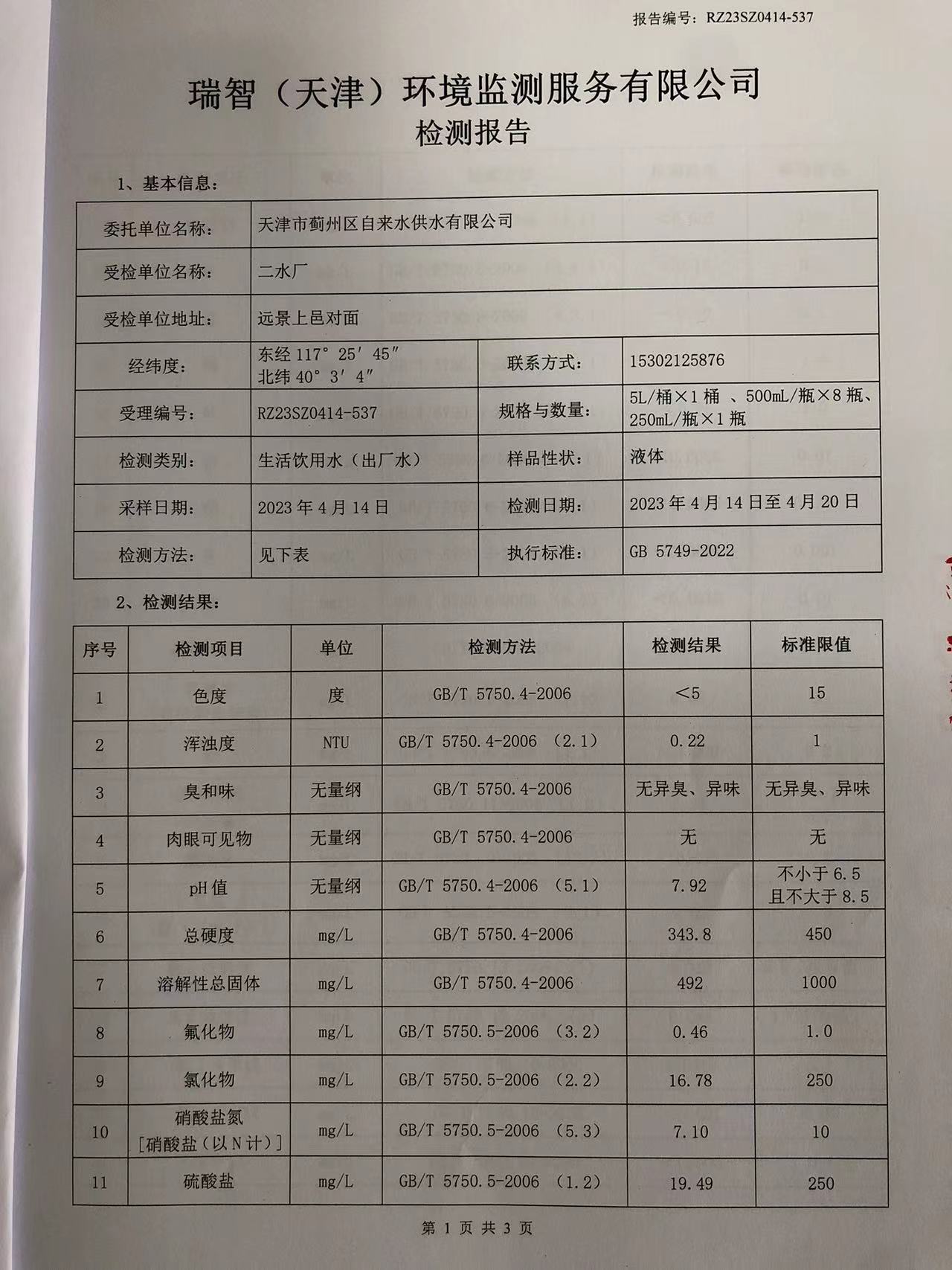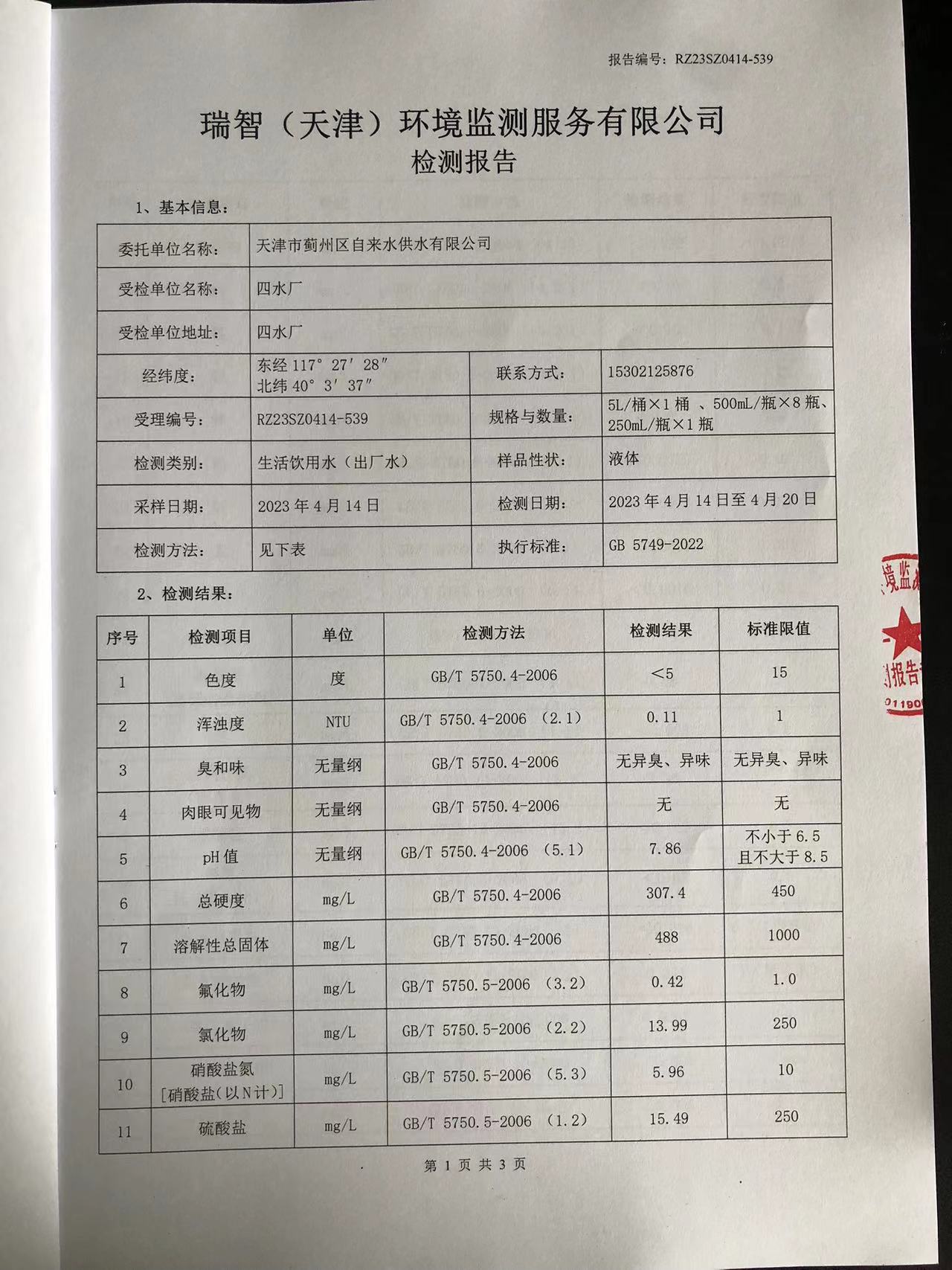 2023年4月份水質(zhì)檢測報告