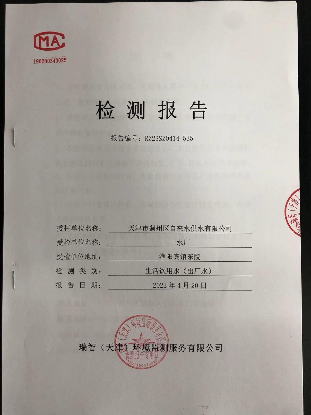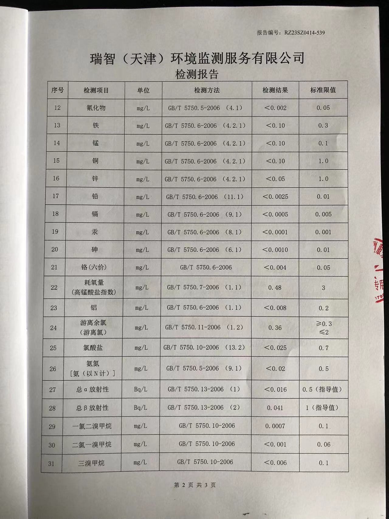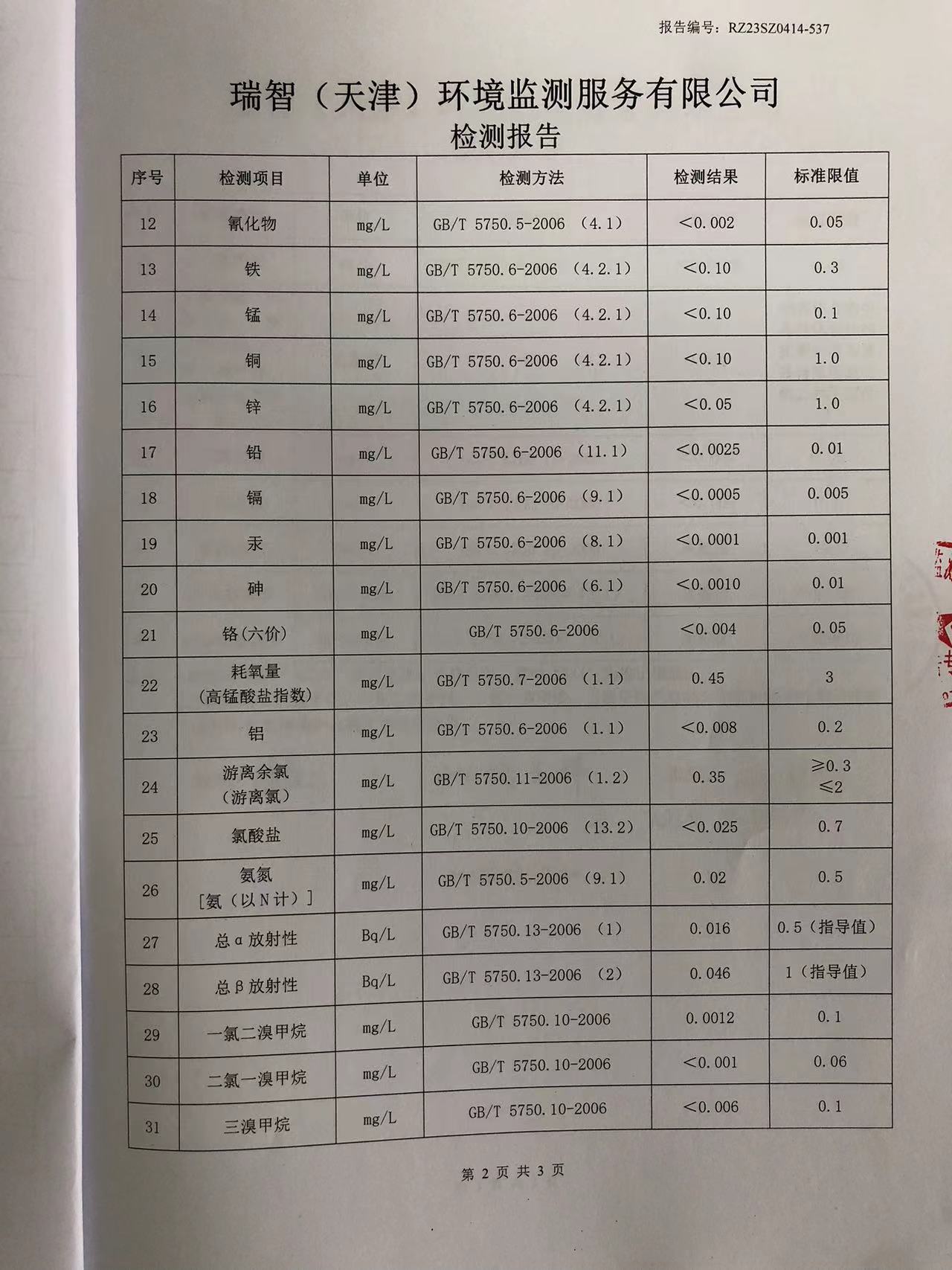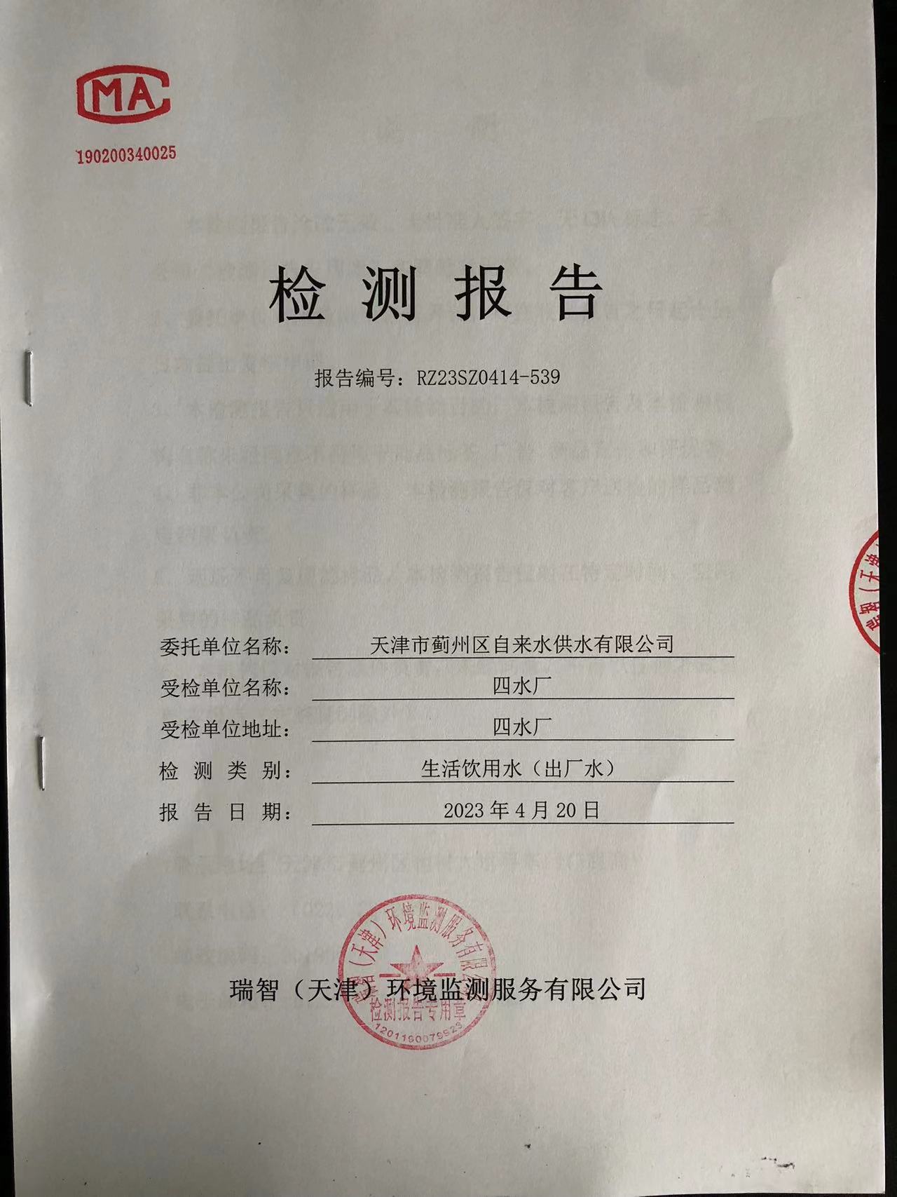 2023年4月份水質(zhì)檢測報告
